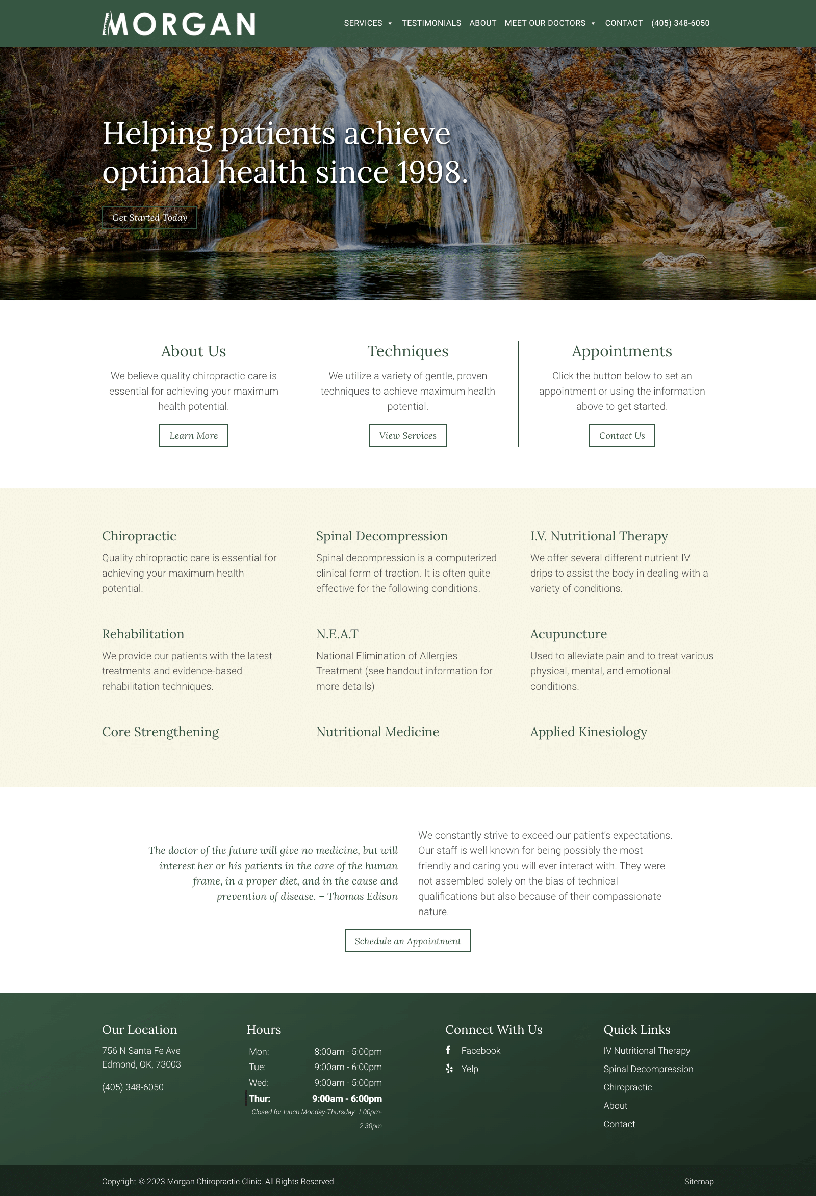 We crafted a clean, easy-to-navigate website that reflects Morgan Chiropractic Clinic’s professionalism and patient-focused approach. The design emphasizes clarity, accessibility, and mobile responsiveness—making it simple for visitors to explore services, meet the team, and schedule appointments with confidence.
